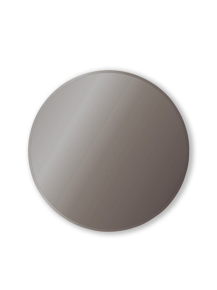 Et grått sirkulært klassisk speil i størrelse Ø60 cm. Finnes også i en større variant i fargene rosa og brun.