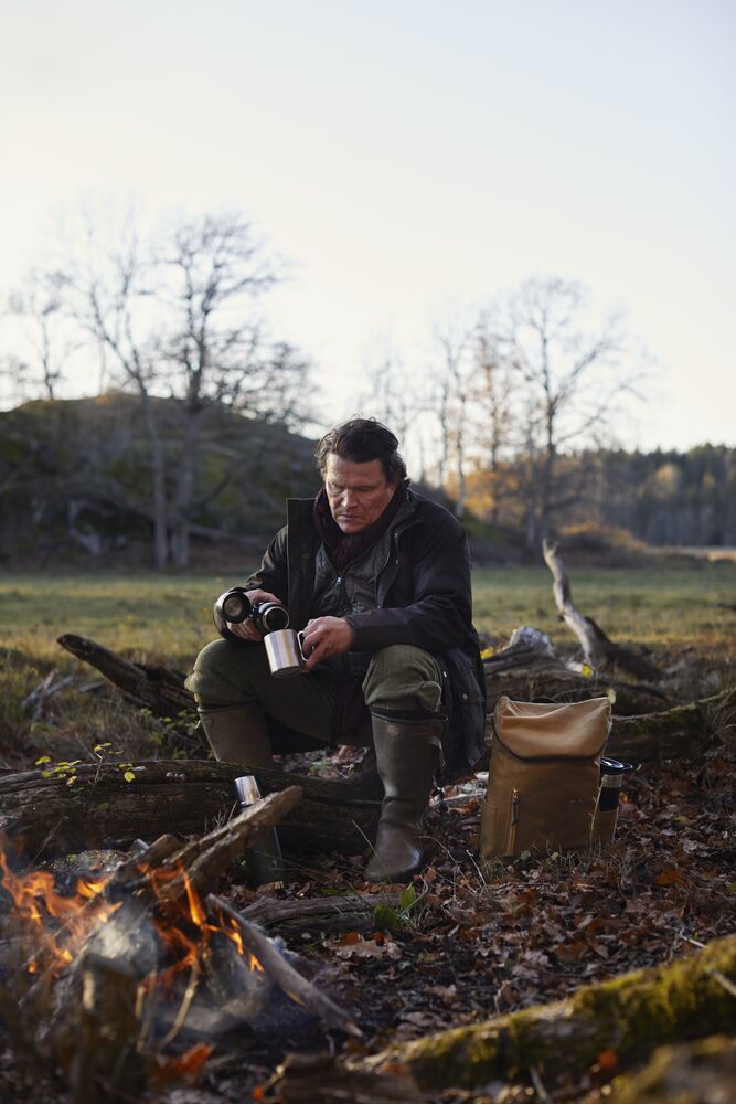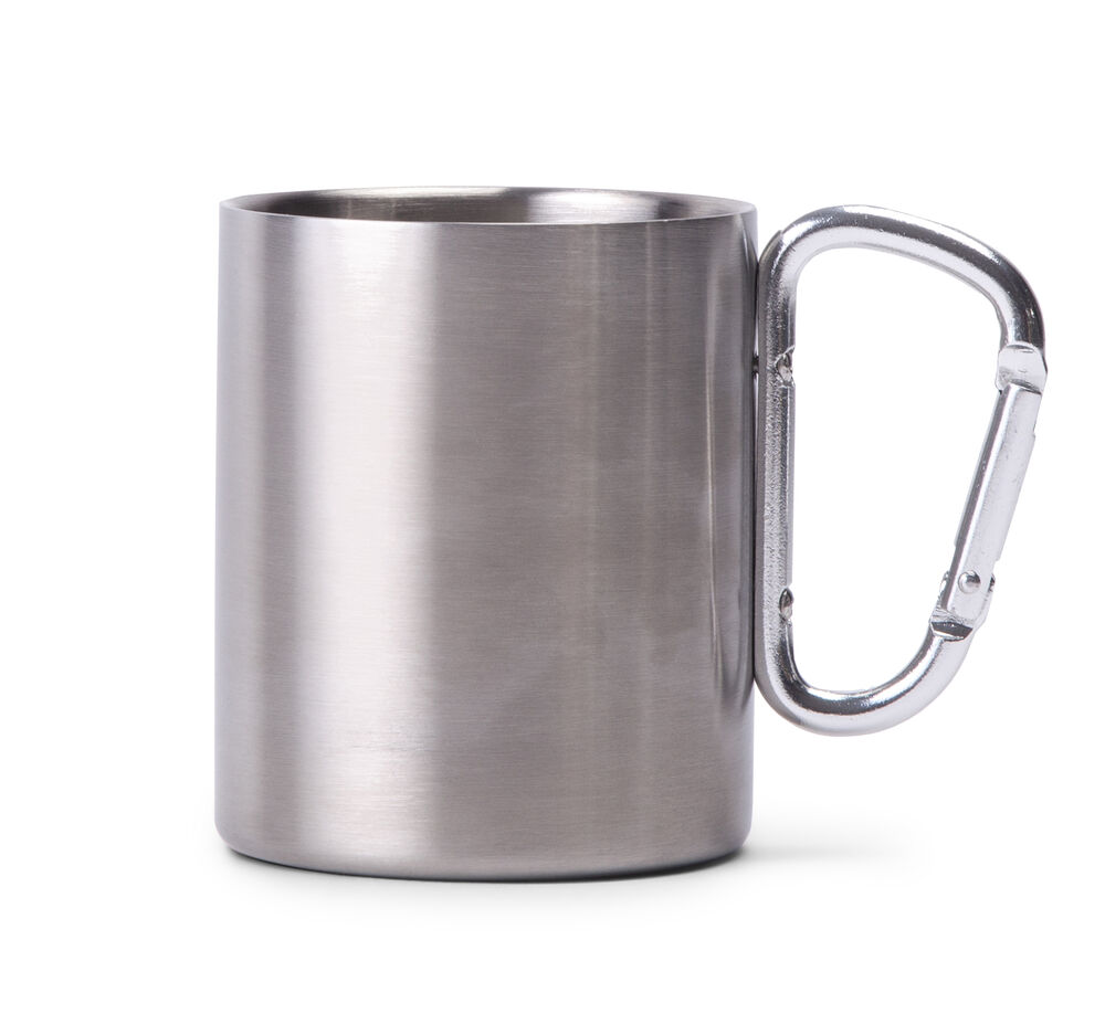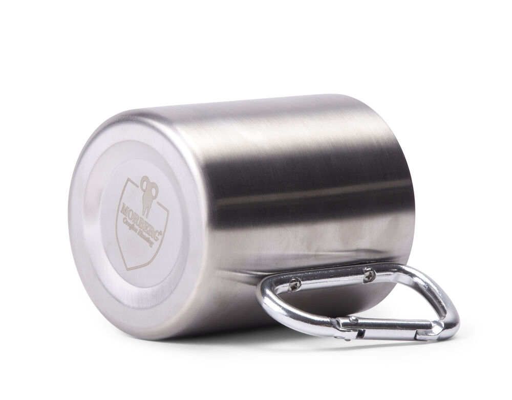 Vakuumisolert kopp av rustfritt stål med doble vegger hvor innerveggen er belagt med kobber for å gi best mulig varmekapasitet. Håndtaket har en karbinkrok.
