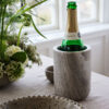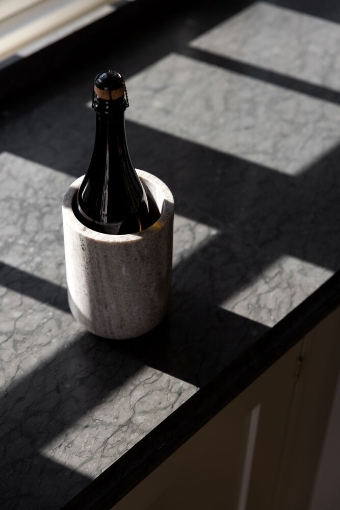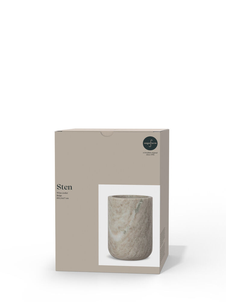 Stilig og naturnær, nedtonet og beskjedent luksuriøs! Sten vinkjøler har en rett form med avrundet bunn. Materialet Travertin-marmor er tungt og solid, og fargen er naturlig beige med et tradisjonelt marmormønster. Sammen blir det en vinkjøler med et sterkt og naturlig uttrykk. Legg vinkjøleren i fryseren i et par timer før bruk, eller legg is i bunnen for å holde drikken kald. Sten vinkjøler er designet for å være tidløs – formen og materialet går aldri av moten. Et bærekraftig tips er å bruke vinkjøleren som vase når den ikke brukes til å kjøle drikke.