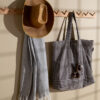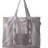 En romslig strandveske i kraftig bomull hvor du får plass til alt du trenger for en dag på stranden. Lommen på siden gir plass til mindre løse gjenstander og solide håndtak håndterer våte håndklær og strandfunn på vei tilbake.