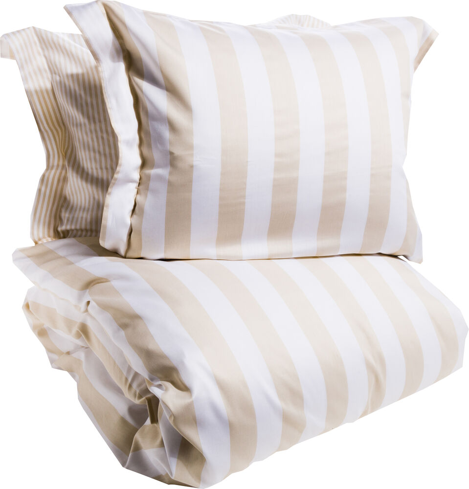Maritimt sengesett av bomullsatin med brede striper på den ene siden og smale striper på andre siden. Leveres med to putevar.