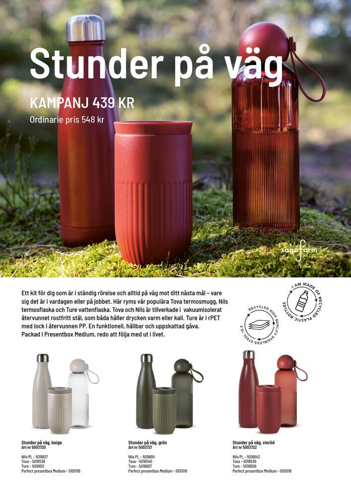Et sett for deg som er i stadig bevegelse og alltid på vei mot ditt neste mål – enten det er i hverdagen eller på jobben. Her finner du vår populære Tova-termokopp i vakuumisolert, resirkulert rustfritt stål, vår tidløse termoflaske Nils – også i vakuumisolert, resirkulert rustfritt stål – som begge holder drikken varm eller kald underveis, og den lette og stilrene vannflasken Ture i rPET med lokk i resirkulert PP. En funksjonell, bærekraftig og verdsatt gave – pakket i gaveeske, klar til å bli med ut i livet. Settet inneholder 1 stk. Tova beige (5018538), 1 stk. Ture beige (5018612), 1 stk. Nils PL beige (5018617) og Perfect gift box Medium (5100116).