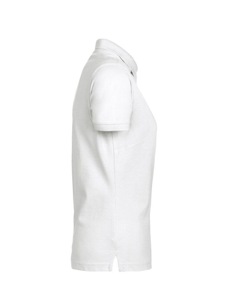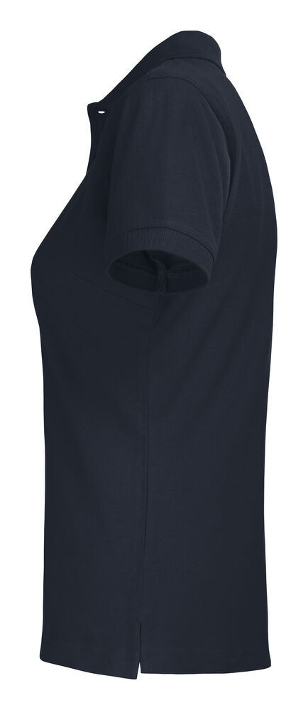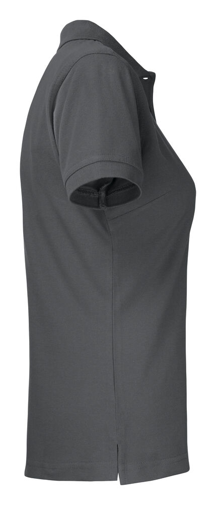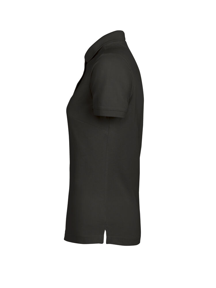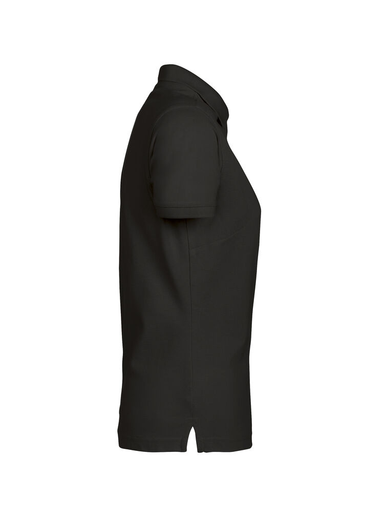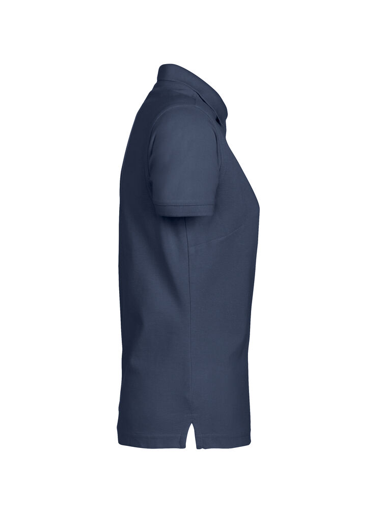 Damepique med tre knapper i stolpe, nakkebånd, splitt i siden, og ribb i ermavslutning.