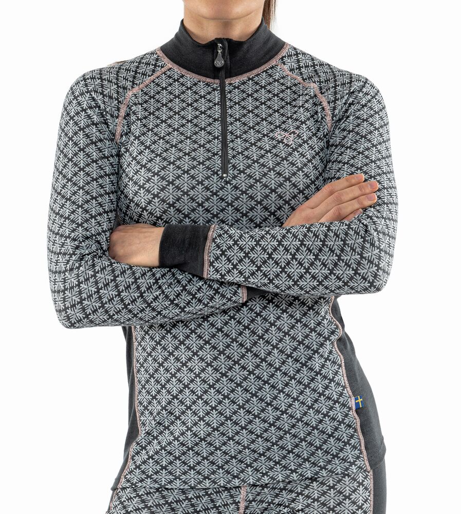 Undertrøye for dame med litt høyere hals og glidelås. God på fukttransport og er naturlig antibakteriell. Perfekt for deg som bryr deg om miljøet og ønsker å ta bærekraftige valg. Passer utmerket til fysisk aktivitet utendørs, alt fra langrenn med høy intensitet til gåturer.