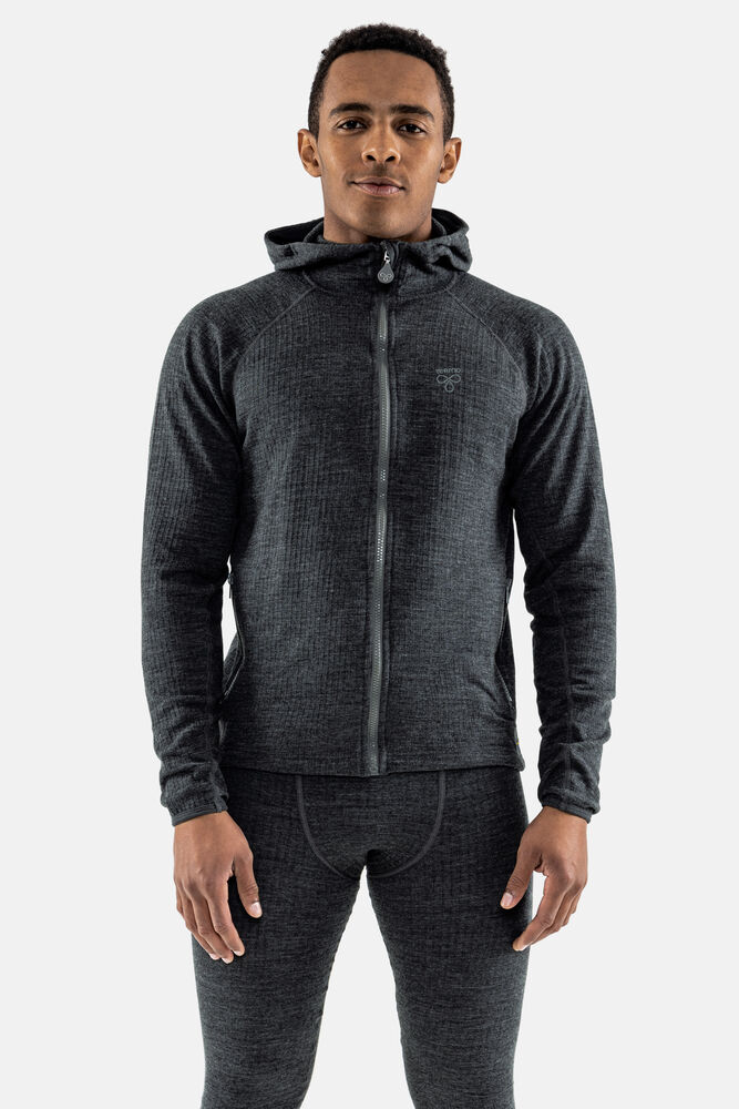 Undertøysgenser i ull, med hette og to glidelåslommer foran. Lange ermer med liten kant som glir inn i mansjettene. Myke sømmer for å forhindre gnagsår. Kvaliteten er myk og behagelig med behagelig stretch.