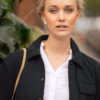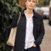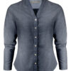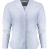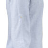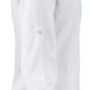 V-halset, krageløs skjorte laget av en blanding av bomull og lin. Skjorten har justerbare mansjetter, og er kontrastfarget på innsiden av bærestykket og mansjettene. Perlemor-knapper. Garnfarget.