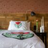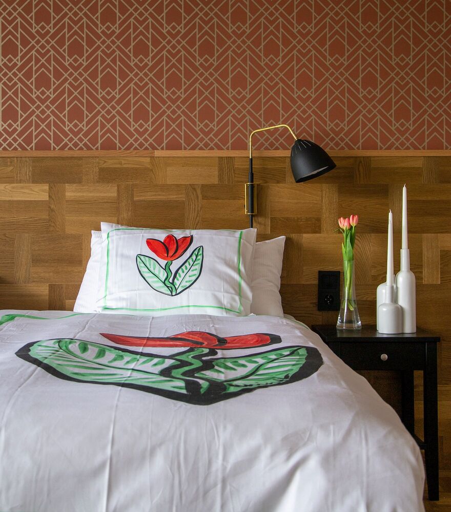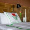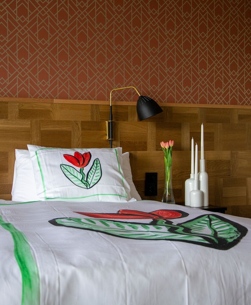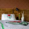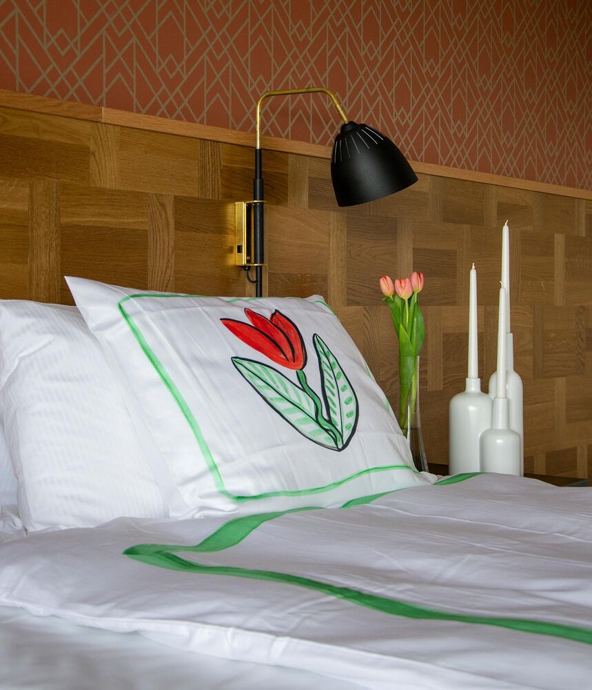 Sengesett og putevar av bomullsateng, med motiv av Ulrica Hydman-Valliens velkjente tulipan.