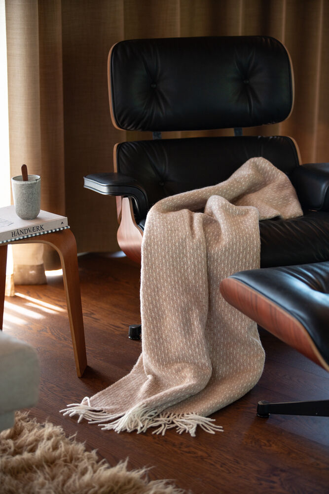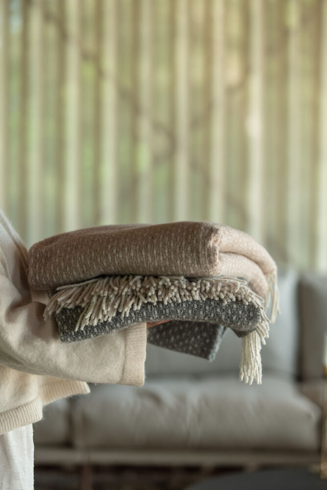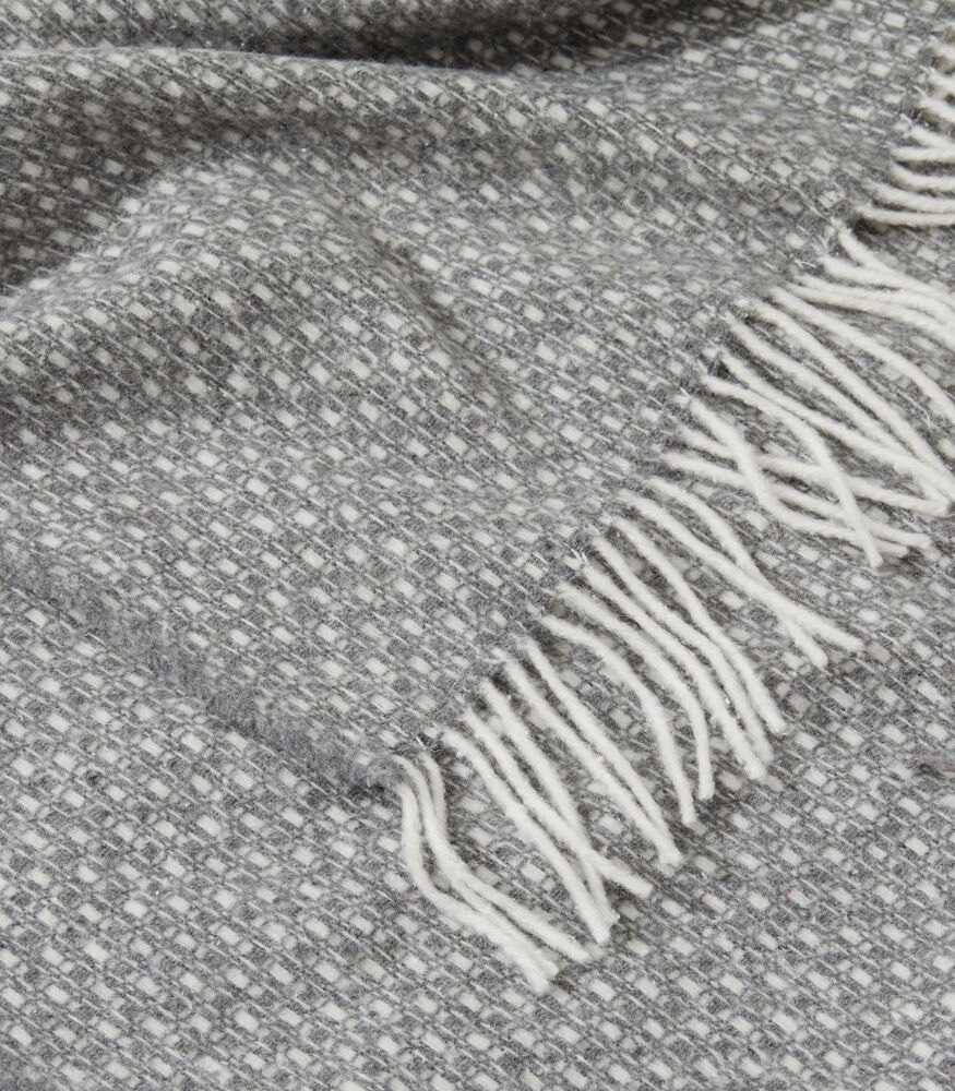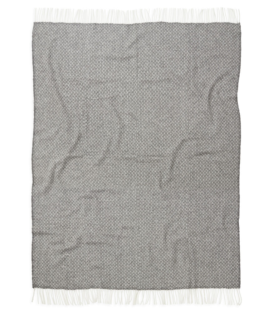 Mykt og behagelig teppe med frynser vevd i en varmende ullblanding. Tidløst og elegant design som enkelt gir liv til en sofa eller seng.