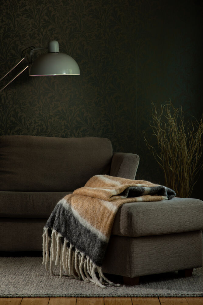 Dette stripete, håndvevde pleddet er både koselig og stilig! Laget av høykvalitets ull og akryl, og med store, tykke frynser som gir en ekstra touch av eleganse. Perfekt for å krølle seg sammen på en kald vinterkveld. Fin å kombinere med Ullpledd 410776
