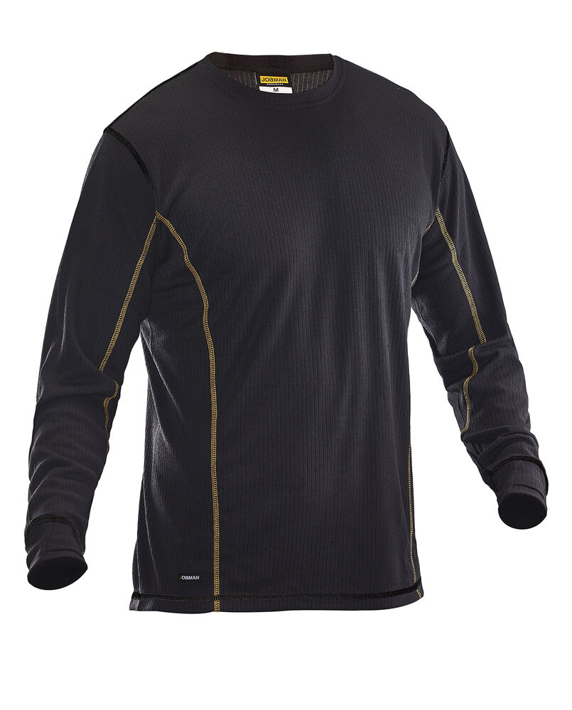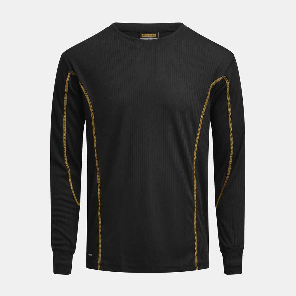 Undertrøye med rund hals i ribbestrikket gjenvunnet polyester med forlenget rygg. Tommelhull på mansjetter. Flatlocksømmer i kontrastfarge. Finnes som longs, modell 2570.