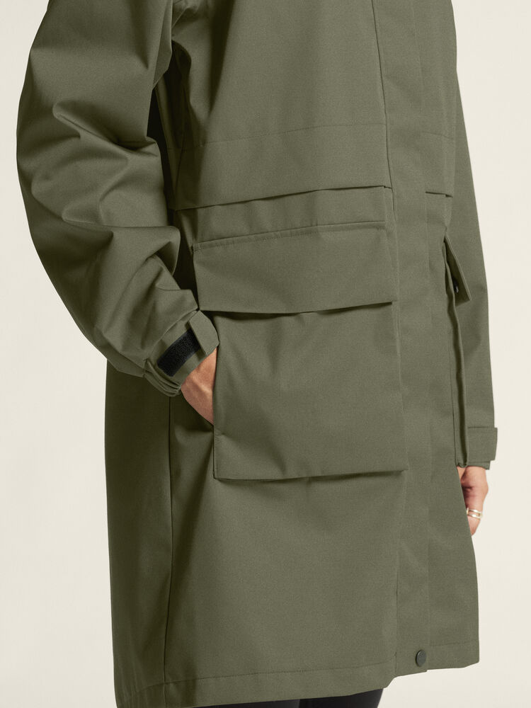 Denne stilige parkasen er laget av et vannavvisende og slitesterkt stoff og har teipede sømmer på kritiske steder, slik at du holder deg tørr på våte høst- og vinterdager. For ekstra varme under kalde forhold kan du ta på deg et mellomlag under. Parkasen har også en justerbar hette, store lommer foran og en midje som kan justeres for en skreddersydd passform og silhuett. Enten du pendler gjennom byen eller utforsker naturen, har denne jakken det du trenger.