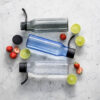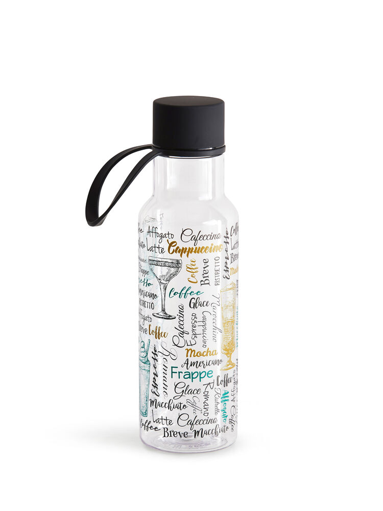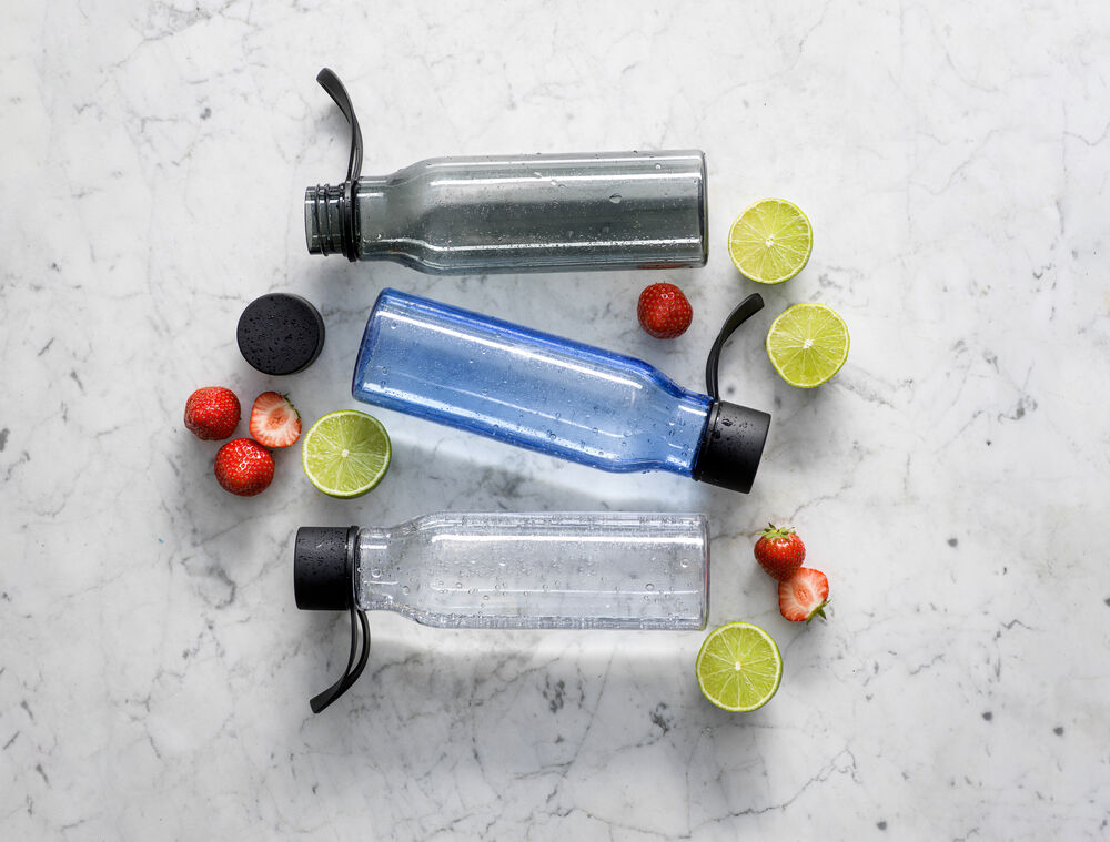Stilig og praktisk vannflaske laget av BPA-fri Tritan-plast. Lokket er av rustfritt stål dekket av svart gummi for å gi et godt grep når flasken skal åpnes. Flasken egner seg veldig godt til branding/logotrykk.