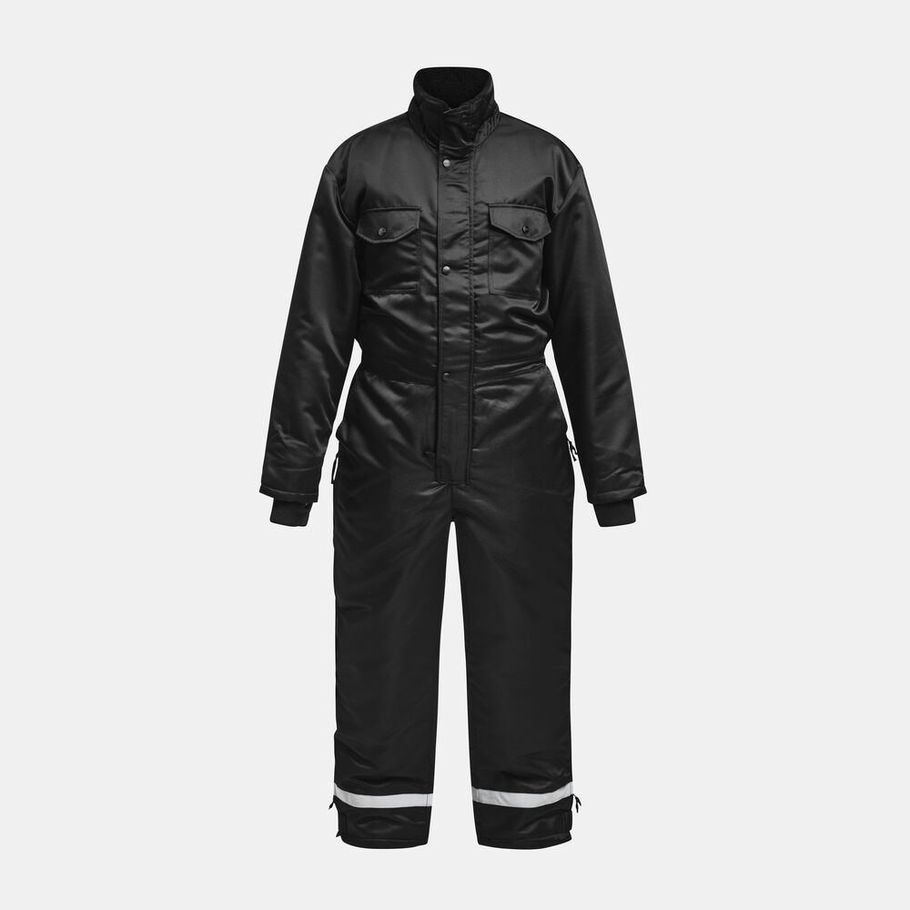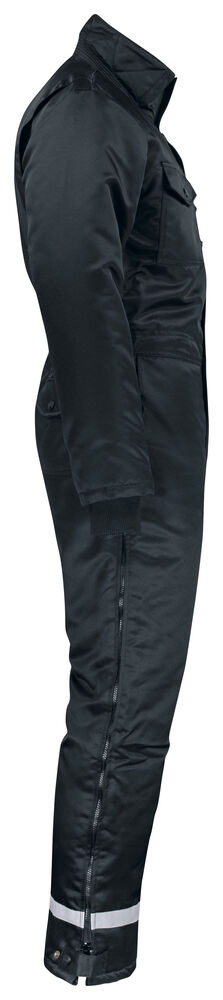 Lett quiltfôret vinterkjeledress. Polyester med PU-belegg på innsiden for vind- og vannavvisning. Toveis glidelås med vindklaff opp i kragen. Brystlommer med klaff. Lomme under vindklaffen. Innsydde lommer foran. Baklommer med klaff. Innerlomme med mobiltelefonlomme. Elastikk i midjen. Innvendig mansjett med tommelhull. Glidelås i bena helt opp til hoften. Innvendige knebeskyttelseslommer. Refleks på bena. Gummiovertrukkede knapper.