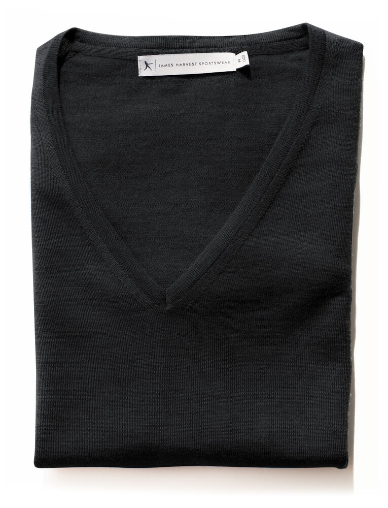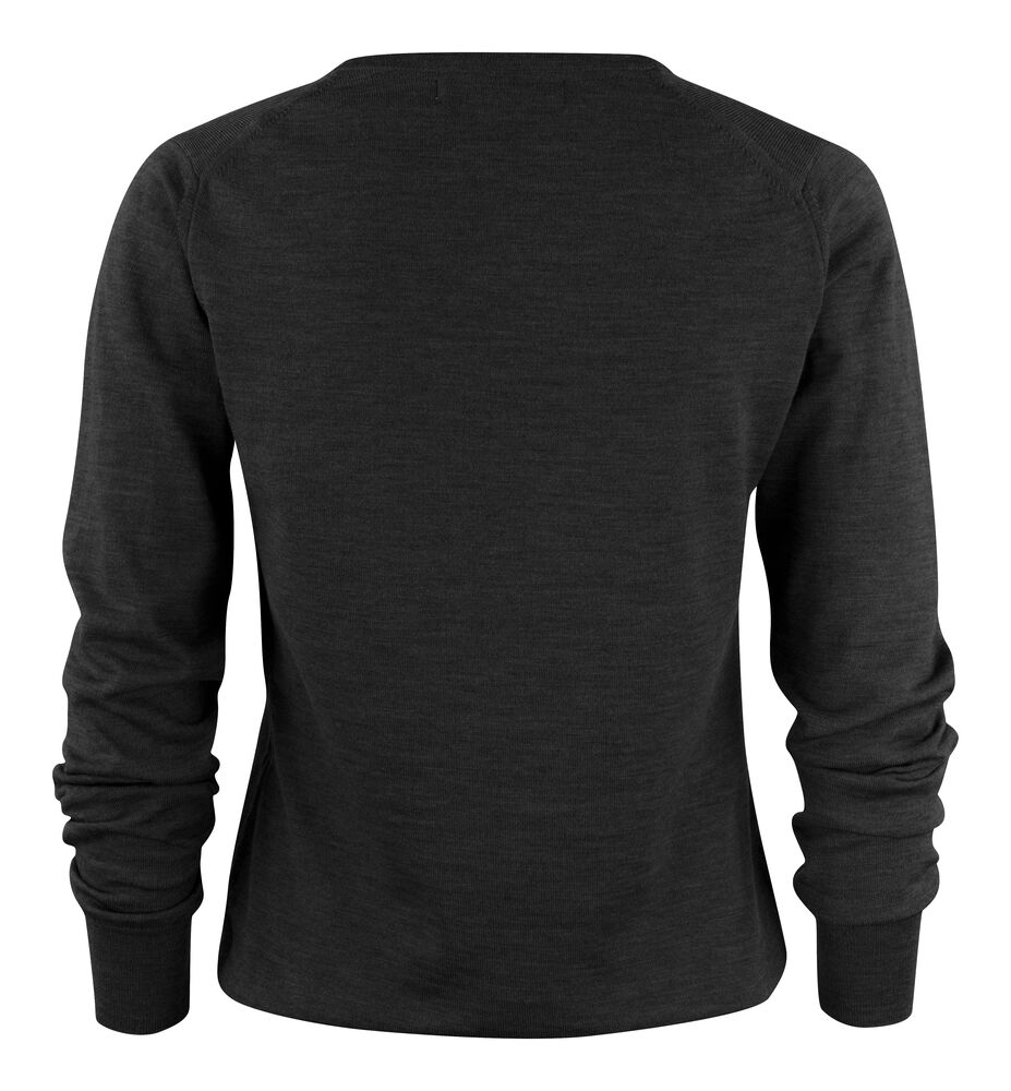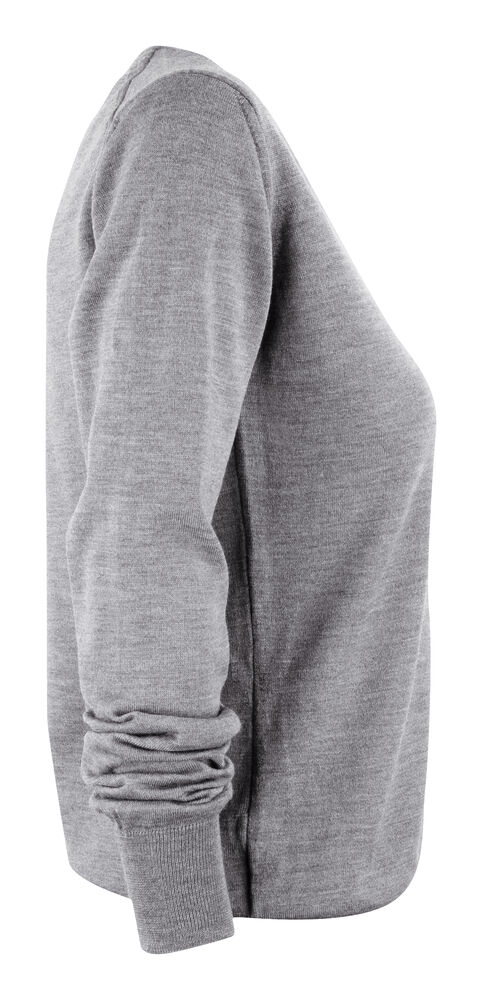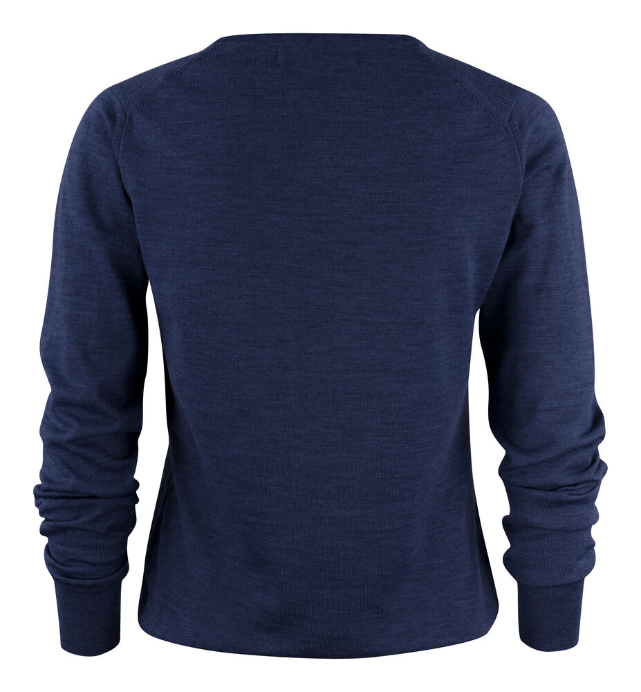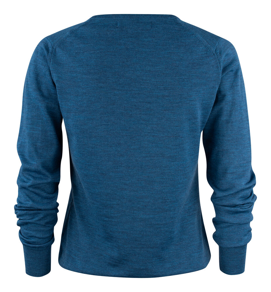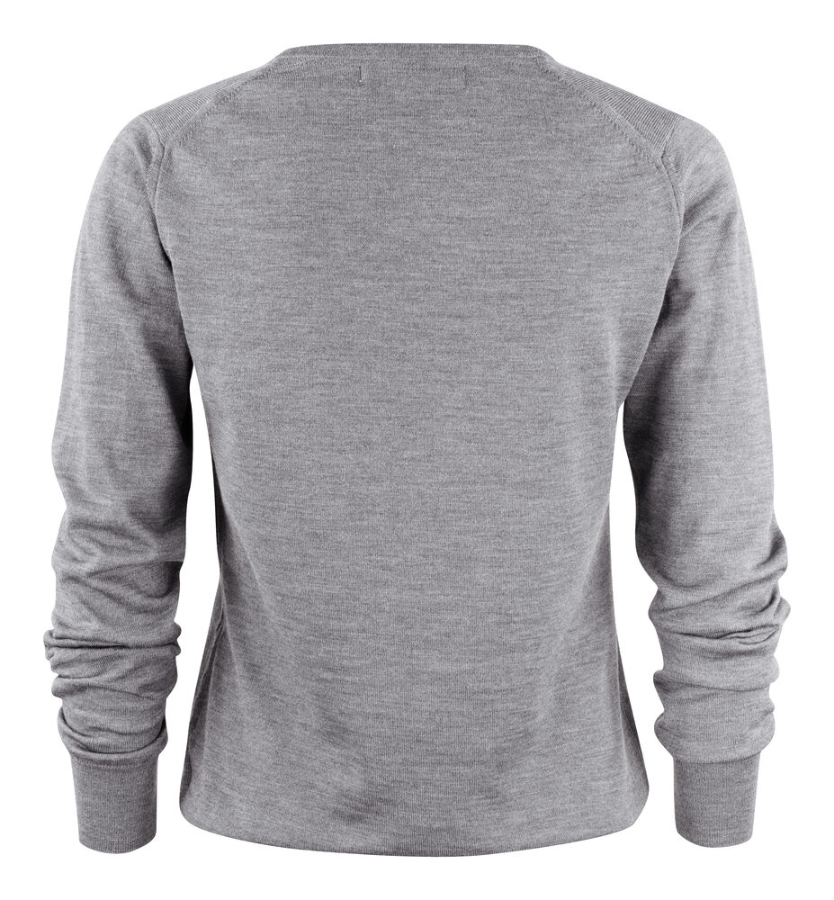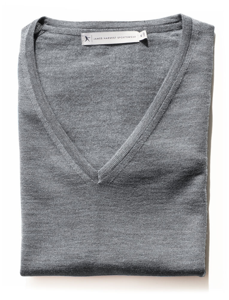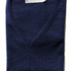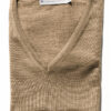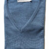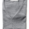 Finstrikket genser med V-hals i Baruffa merino. Dobbelfoldet enkeltstrikk i nakken. 1×1 ribb i nederkant og i ermene.