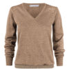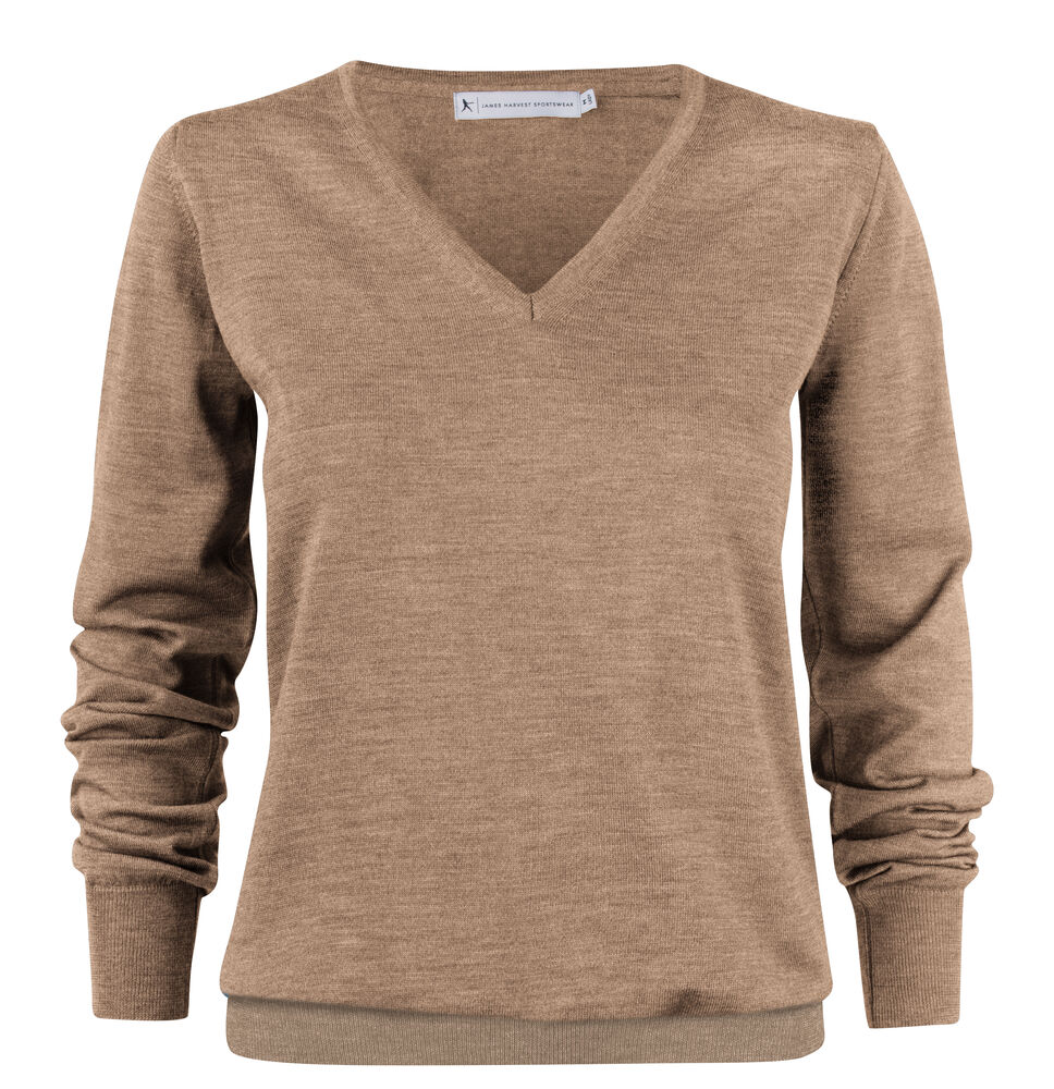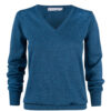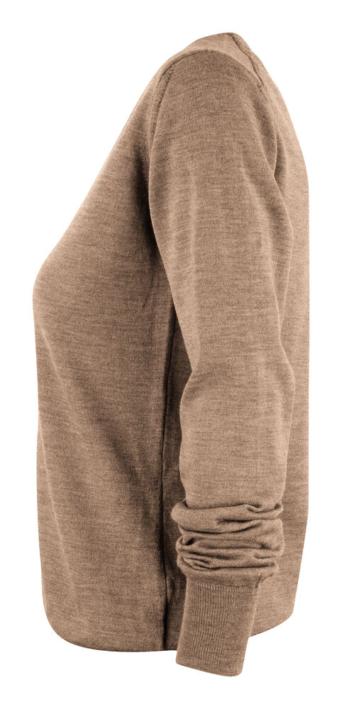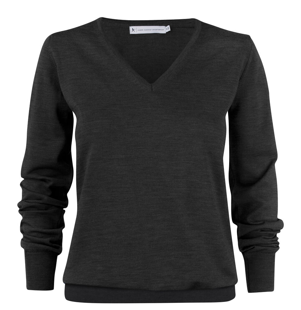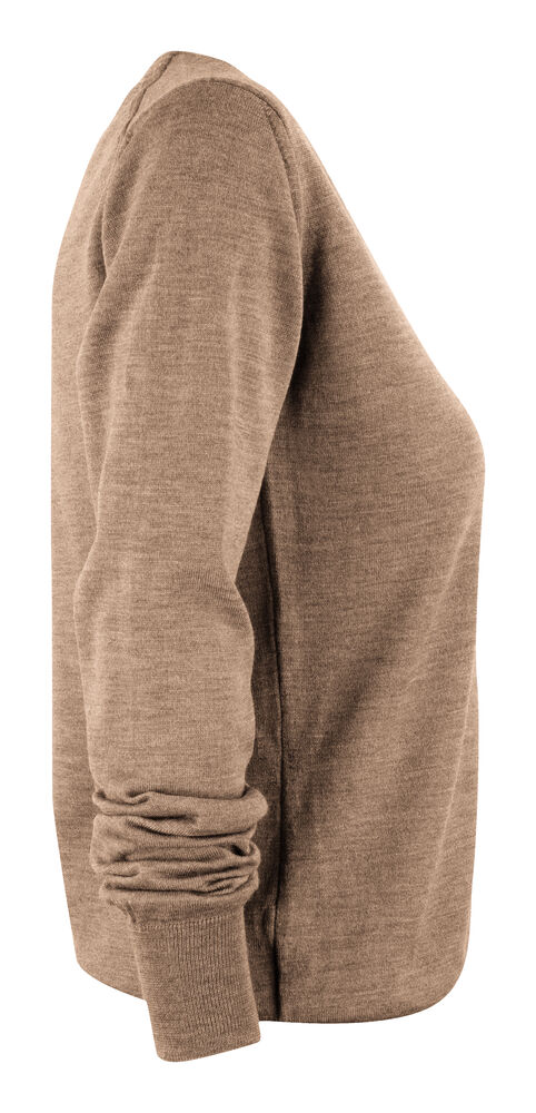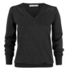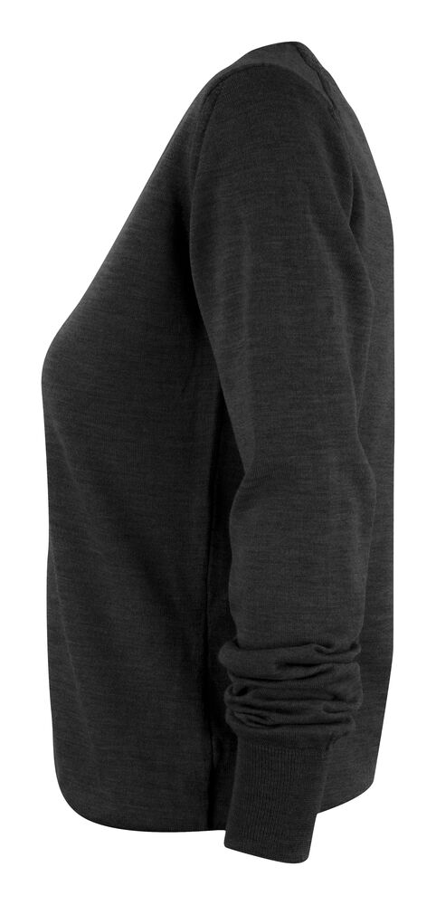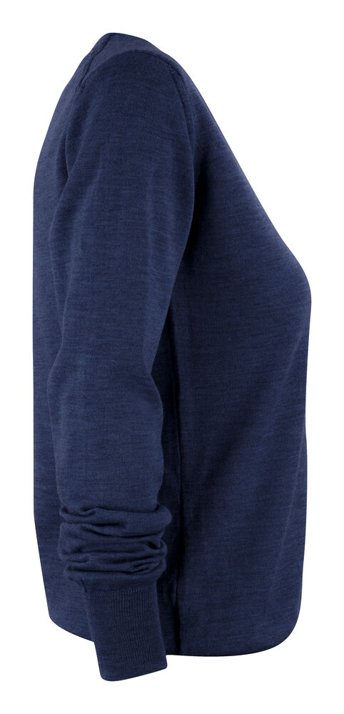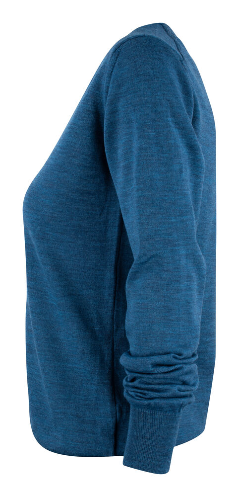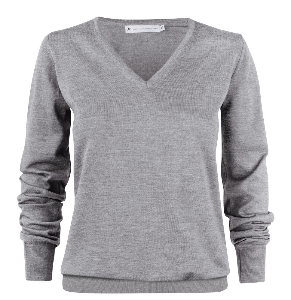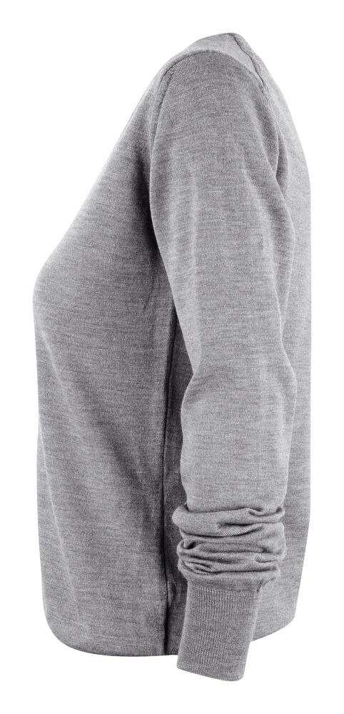 Finstrikket genser med V-hals i Baruffa merino. Dobbelfoldet enkeltstrikk i nakken. 1×1 ribb i nederkant og i ermene.