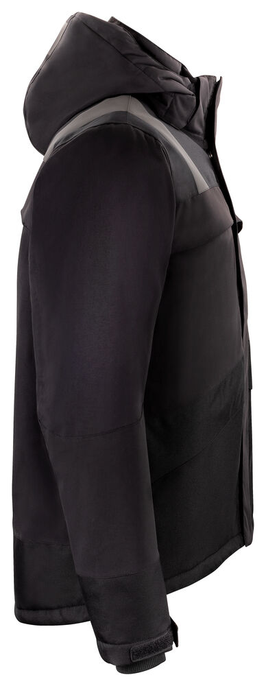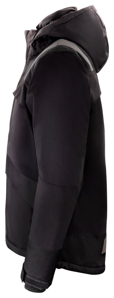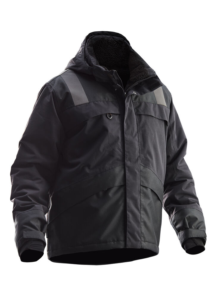 Varmfôret, vind- og vanntett jakke i 2-lags polyamid taslan med tapede sømmer og god pusteevne. Forsterket i oxford-polyester på utsatte steder. Påvarmede Jobman-reflekser på skuldrene og nederst på ryggen for økt synlighet. Dobbel vindbeskyttelse i front beskytter mot kald luft og hindrer at regn trenger inn. Mykt og behagelig teddyfôr på innsiden av kragen og på innsiden av skuldrene. Ventilasjon på bærestykket bak. Hette med snøring, avtagbar med trykknapper. Justerbar med snøring nede og litt lengre rygg. Smidig ribb med tommelgrep på innsiden av ermets slutt, og justerbar på utsiden med borrelås. To store brystlommer med glidelås, derav en Napoleonlomme under vindklaffen. D-ring for ID-kortholder i høyre brystlomme. To romslige frontlommer med skjult glidelås. To innerlommer i mesh, til f.eks. hansker. Vannsøyle: 11 000 mm. Pusteevne: 6000 g/m² 24h.