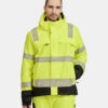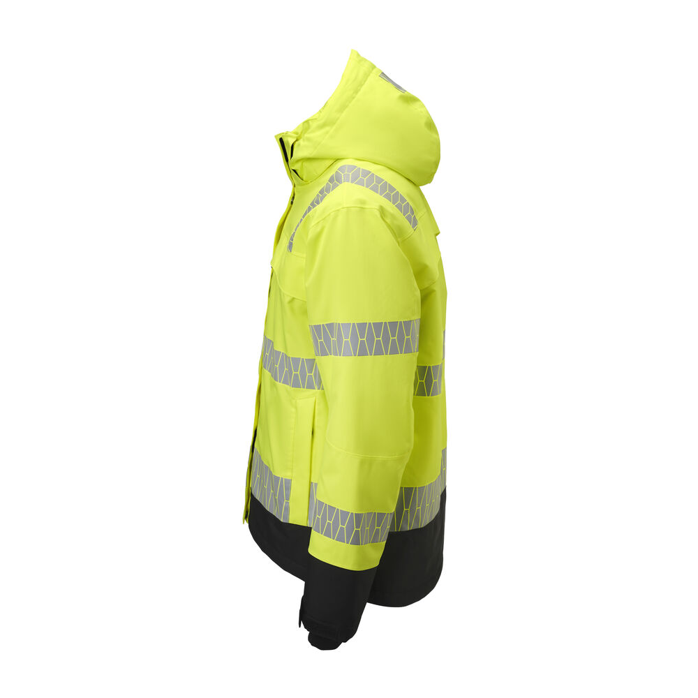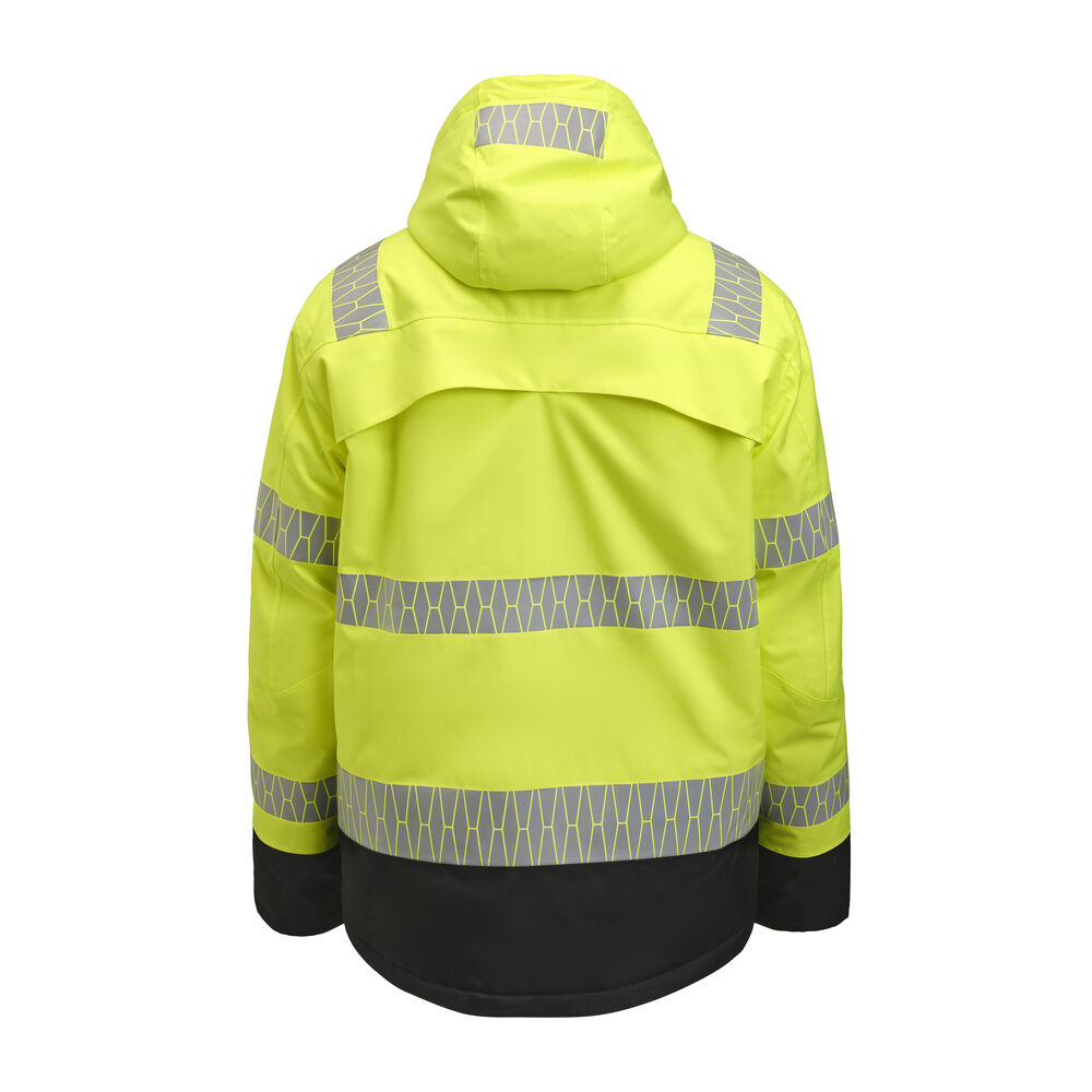 Varmfôret, vind- og vanntett jakke i 2-lag med teipede sømmer og god pusteevne. Forsterket i Oxford-polyester på utsatte steder. Påvarmede Jobman-reflekser. Dobbel vindbeskyttelse i front som beskytter mot kald luft og hindrer at regn treger inn. Mykt og behagelig teddyfôr på innsiden av kragen og på innvendig over skuldrene. Ventilasjon på bærestykket bak. Hette med snøring, avtagbar med trykknapper. Justerbar med snøring nede og litt lengre rygg. Smidig ribb med tommelgrep på innsiden av mansjetten, og justerbar med borrelås på utsiden. To store brystlommer med glidelås, derav en Napoleonlomme under vindklaffen. D-ring for ID-kortholder i høyre brystlomme. To romslige frontlommer med skjult glidelås. To innerlommer i mesh, til f.eks. hansker.