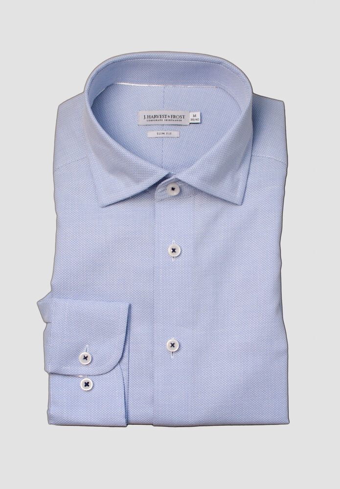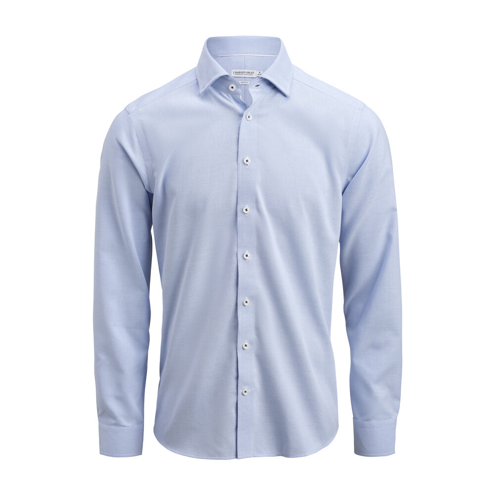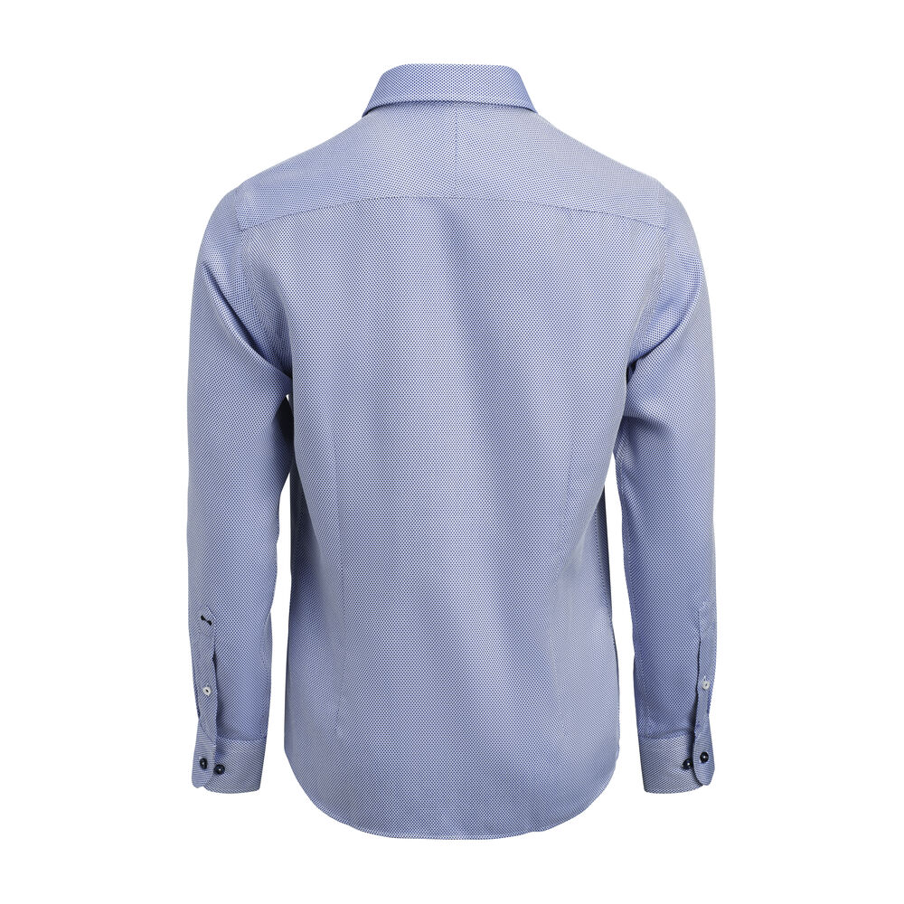 En mikromønstret skjorte i jacquard-veving, laget av en blanding av økologisk bomull og resirkulert polyester. Skjorten har skjult button down-krage og diskrete detaljer som kontrastfarget tråd på knappene og kontraststripe i knappestolpen. En subtil dobbystruktur, kombinert med en myk krage og mansjetter, gir skjorten et smart og moderne utseende. Skjorten er også easy-care behandlet.