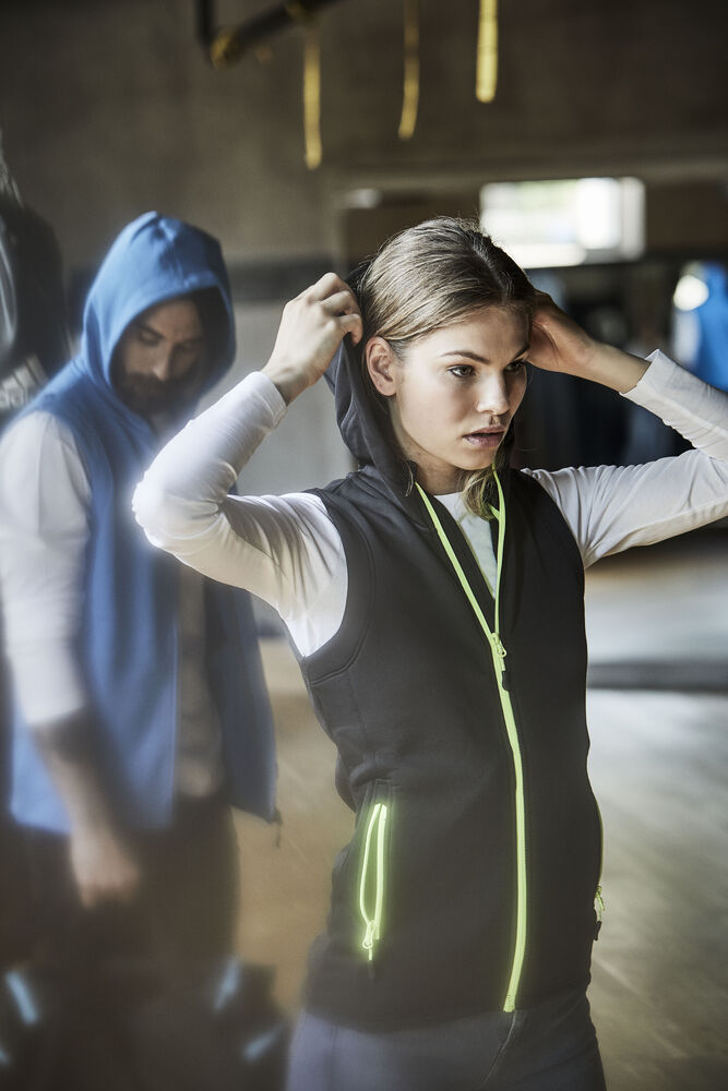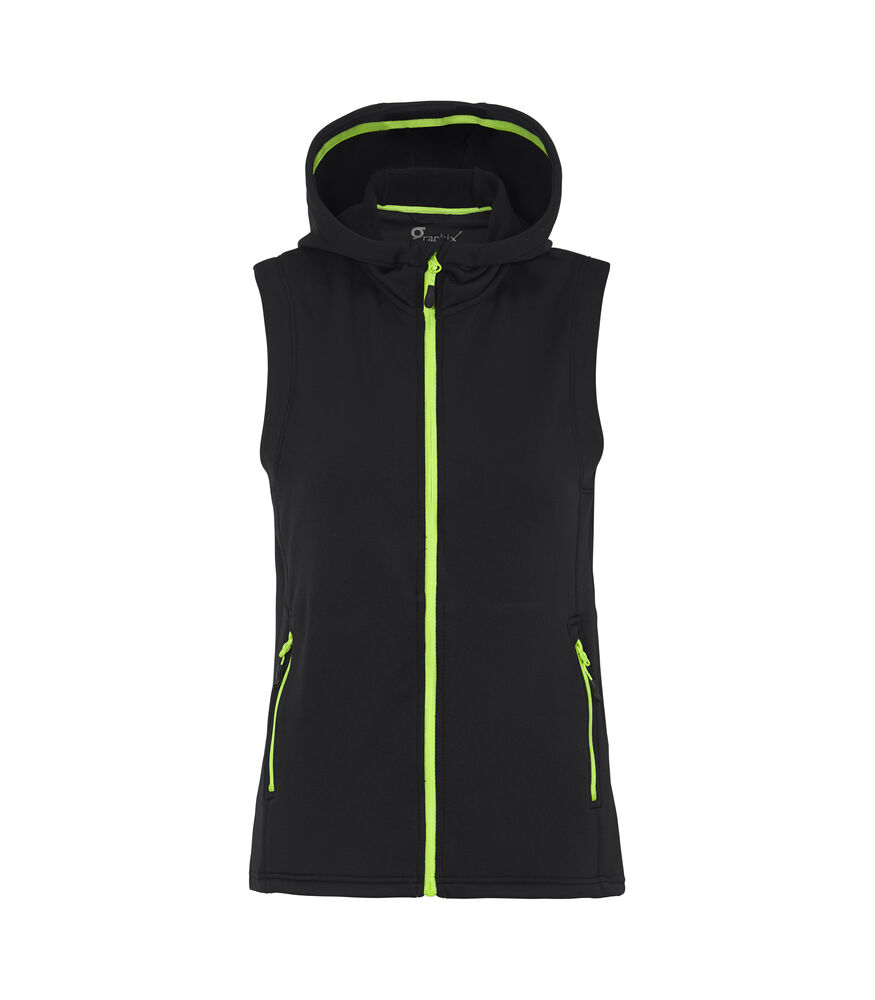 Ermeløs hettejakke med glidelås og to sidelommer. God fukttransport med en kvalitet som varmer.